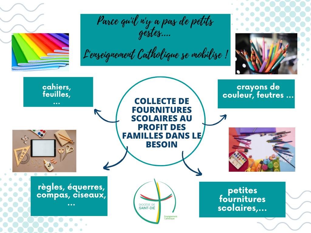 - aux élèves des familles de nos établissements catholiques vosgiens qui ne peuvent plus assurer l'achat de fournitures scolaires,