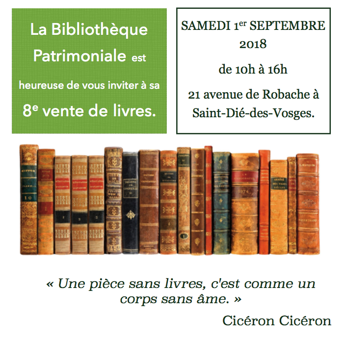 Il est désormais traditionnel que tout début septembre la bibliothèque patrimoniale organise sa grande vente de livre. Pour cette 8e édition, vous sont proposés une grande variété de livres de qualité, neufs et d'occasion, et de tous prix.