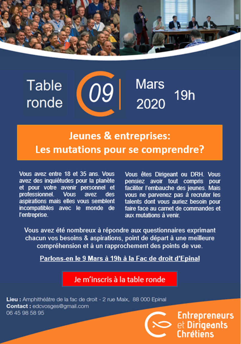 Le lundi 9 mars 2020, une table ronde est proposée à Épinal à 19h à la Faculté de Droit d'Épinal (2 rue de la Maix) autour du thème :