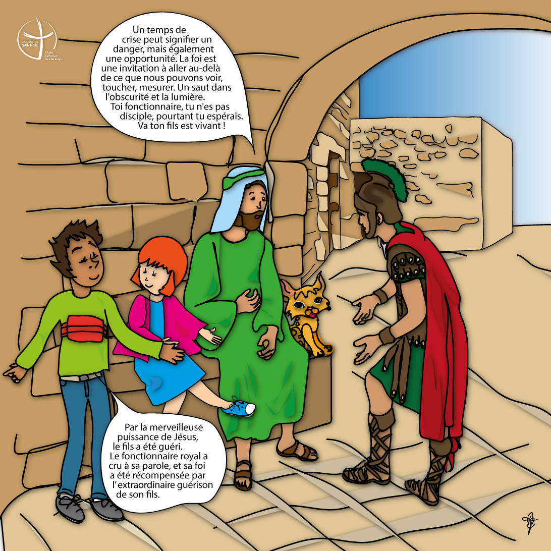 Jésus ne doit pas être un simple messager, n’attendons pas d’être dans les ténèbres pour demander son aide. Il est notre sauveur. Accordons-lui notre confiance, notre temps et continuons à le prier le plus souvent possible, nous serons récompensés, comme ce fonctionnaire qui voit guérir son fils.