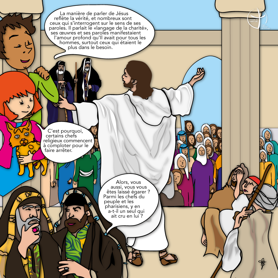 Jésus est à Jérusalem pour la Fête des Tentes. Il enseigne au Temple et se présente comme l’envoyé de Dieu. Il promet même l’Eau vive à ceux qui viendraient à Lui. Certains dans la foule sont enthousiasmés par sa parole et sa personnalité. Mais "ceux qui savent", qui connaissent par cœur les Écritures, disent que c’est impossible : le Messie doit venir de la descendance de David et de Bethléem & Jésus vient de la Galilée, province contaminée par les païens ! La foule est divisée à son sujet. On peut se rappeler les paroles de Siméon à Marie lors de la présentation de Jésus au Temple : « cet enfant sera un signe en butte à la contradiction » (Lc 2,34).