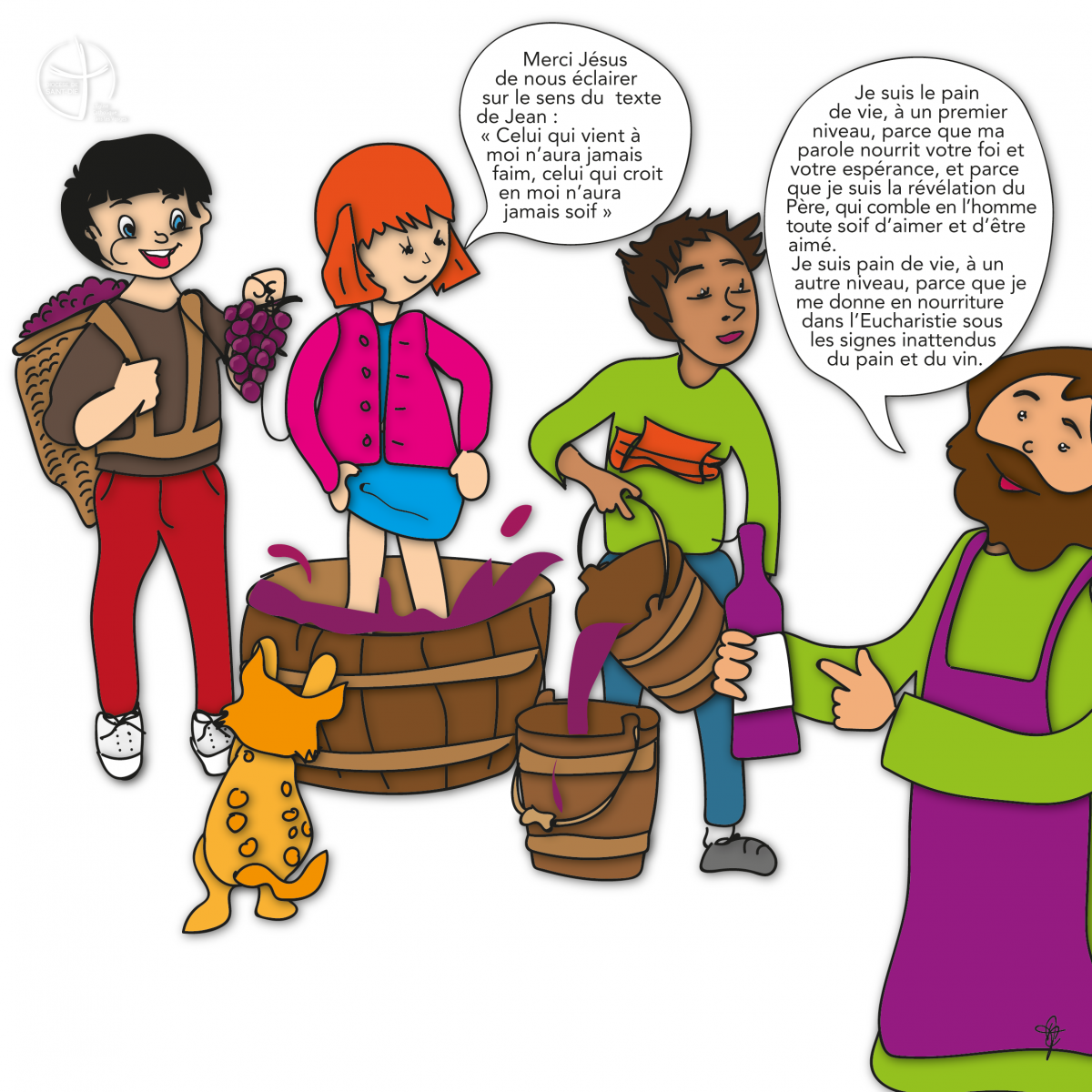 Le mouvement devient vertical, à double sens : Jésus est le pain du Ciel, et nous allons vers lui. Jésus prend le pain, fruit de travail de l’homme et de la terre pour en faire le pain de la Vie descendu du Ciel.