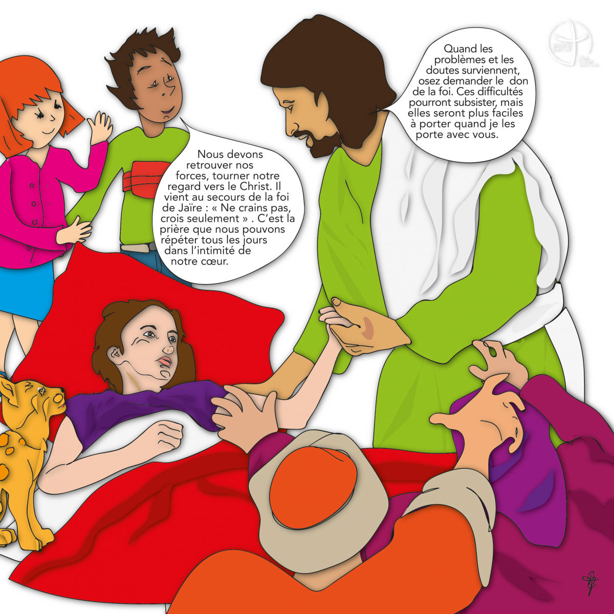 Entre-temps Jaïre apprend la mort de sa fille. Au lieu de sombrer dans le désespoir, il affirme sa confiance totale en Jésus qui saisit la main de l’enfant et lui dit : « Lève-toi ». « Lève-toi – Debout » sont les mots employés dans les évangiles pour dire la résurrection de Jésus. La petite venait de traverser une mort, une femme venait de naître en elle.
