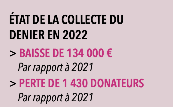 La collecte du denier 2022 a connu une baisse importante de 134 000 € et une perte de 1 430 donateurs, par rapport à 2021.