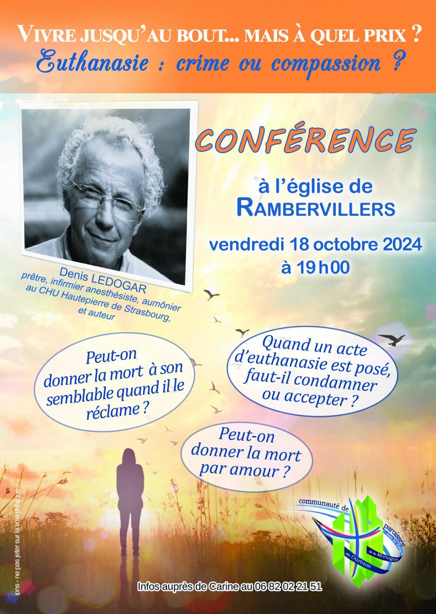 La communauté de paroisses de Rambervillers, de la Mortagne au Durbion, organise une conférence le vendredi 18 octobre autour du sujet de la fin de vie avec le père Denis Ledogar : « Vivre jusqu'au bout... mais à quel prix ? Euthanasie : crime ou passion ? ».