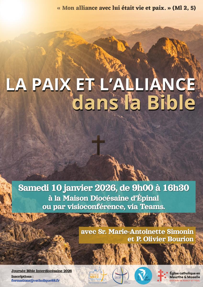 Les diocèses lorrains de Nancy-Toul, Saint-Dié, Verdun et Metz proposent une journée bible le samedi 10 janvier 2026 de 9h à 16h30 sur le thème : « La paix et l'alliance dans la Bible ».