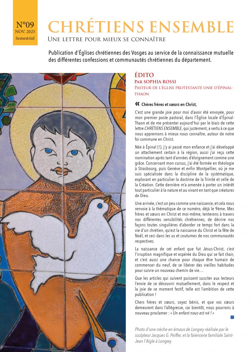 Mgr Berthet écrivait dans son édito de juin 2021 : « Dans cette perspective, je suis heureux de saluer avec vous une nouvelle initiative qui a pris corps en plein confinement sanitaire : une lettre œcuménique intitulée Chrétiens ensemble » qui voit aujourd’hui le jour pour la fête de la Pentecôte. Elle est l’œuvre commune de différentes Églises chrétiennes présentes dans les Vosges (luthéro-réformée, catholique, évangéliques, baptiste, mennonite, bientôt orthodoxe, etc.). Elle se propose, au moins dans une première phase, de répondre à la première démarche qui fonde tout le reste du mouvement œcuménique : mieux se connaître. Ainsi, sur un rythme de deux à trois fois par an, la parution de cette Lettre permettra à chaque fois à une confession chrétienne de se présenter dans ses racines, sa tradition, sa sensibilité propre, mais aussi par des visages et des témoignages.