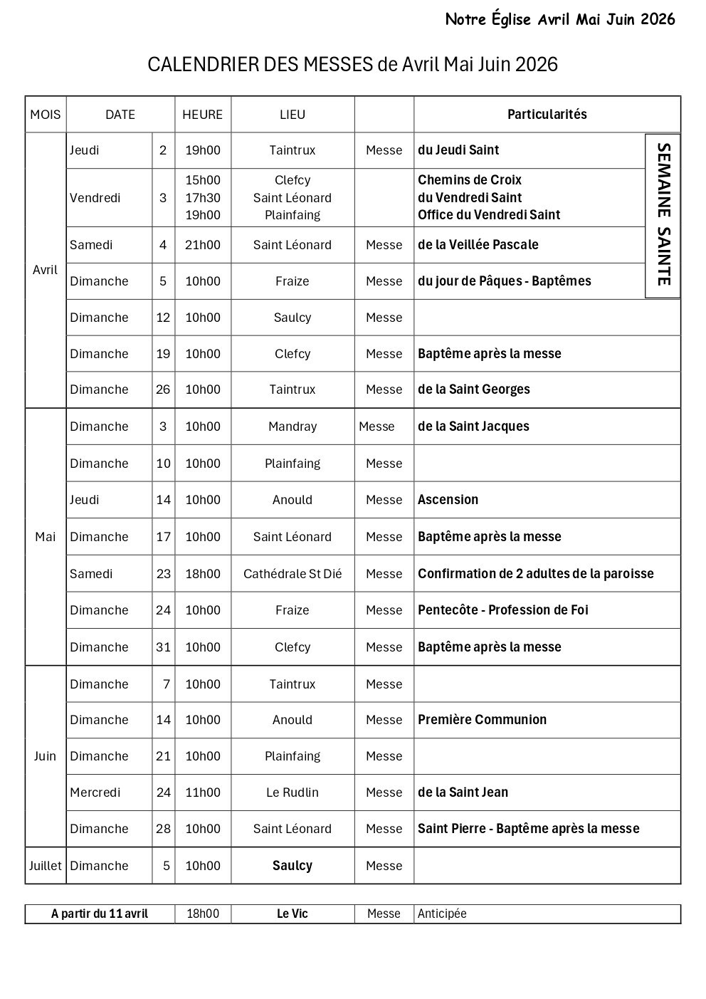 | Dimanche 12 avril - 10:00 | Eglise Saint-Jean-Baptiste de Saulcy-sur-Meurthe |