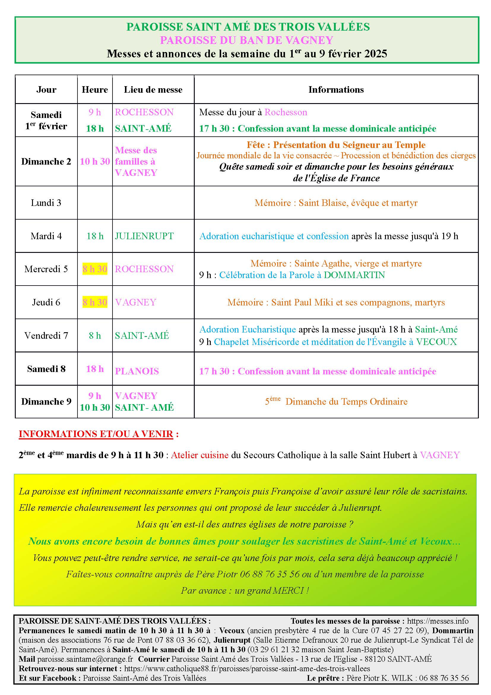 La Paroisse Saint-Amé des 3 vallées regroupe les secteurs de Saint-Amé, Cleurie, Julienrupt, La Forge, le Syndicat, Vecoux et Dommartin-les-Remiremont. Elle est née le jour de la Pentecôte 2000.