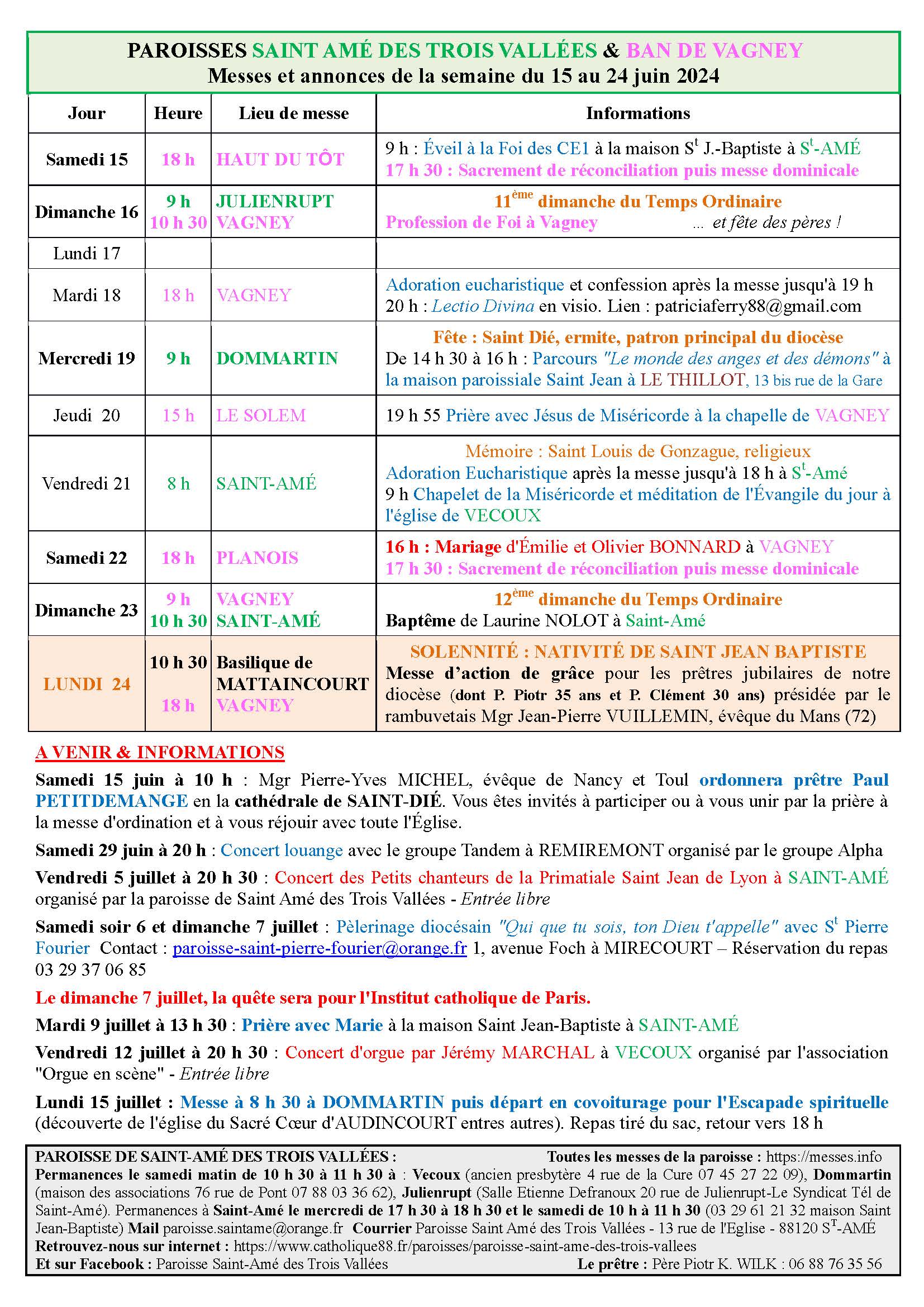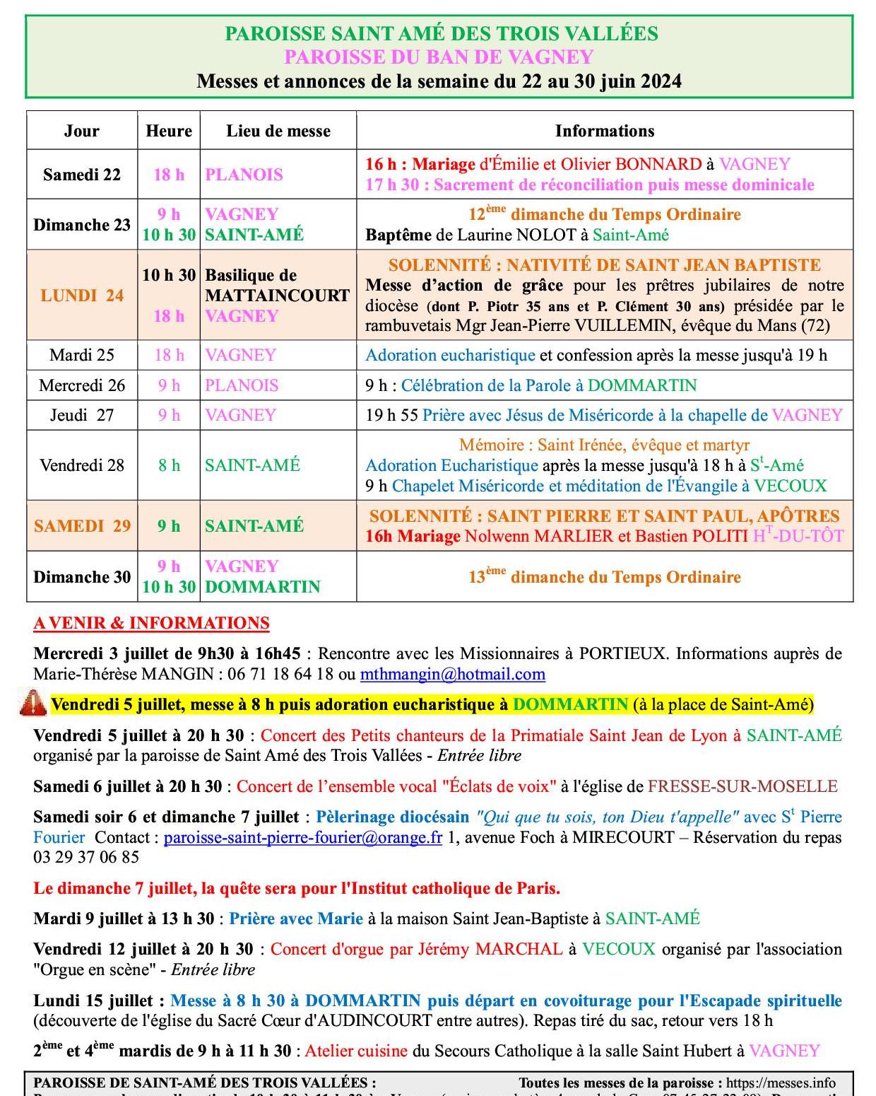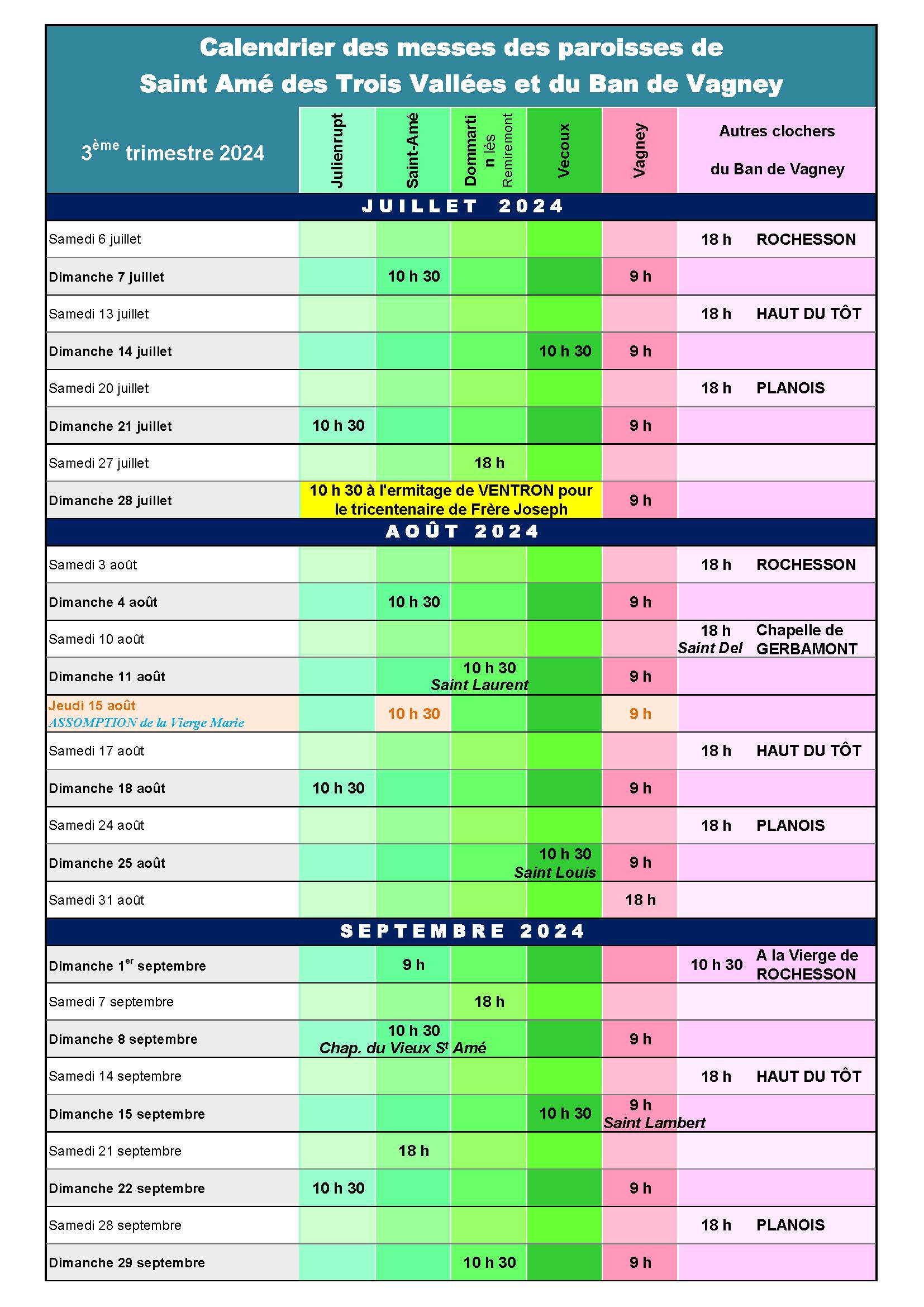 CALENDRIER DES MESSES DU 3e trimestre 2024