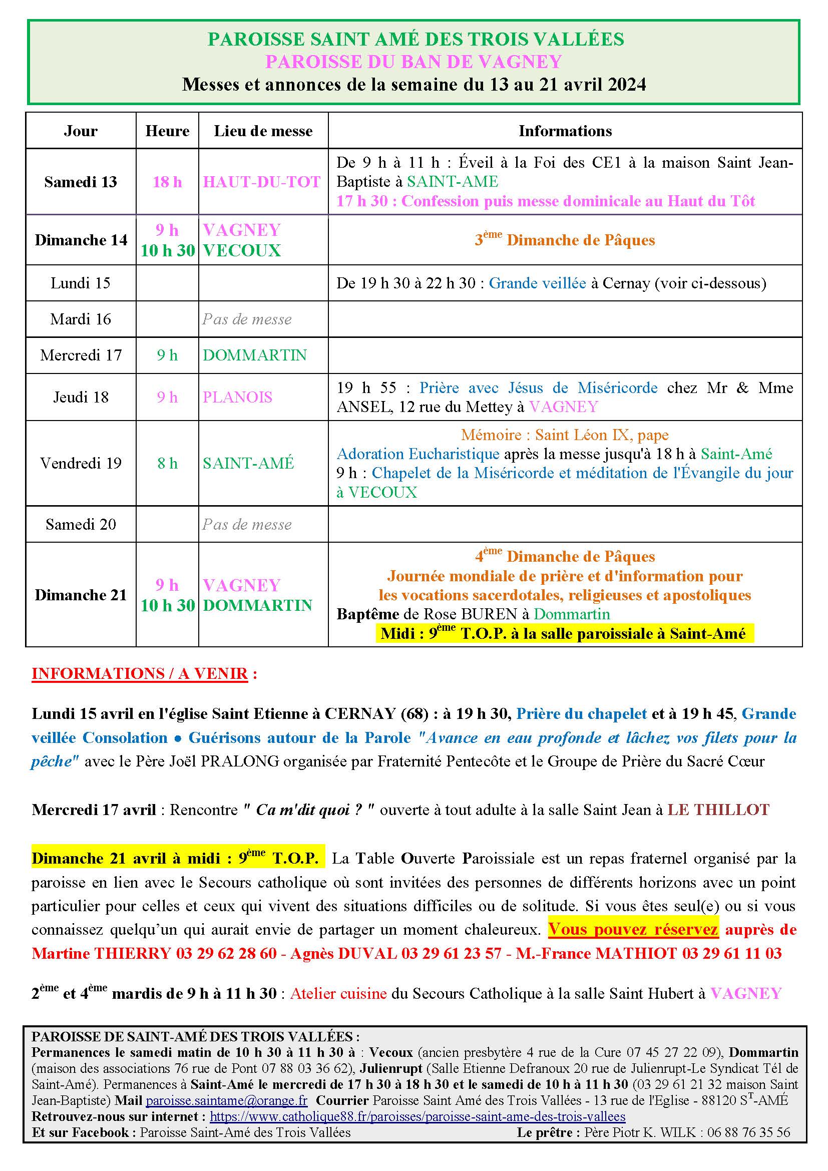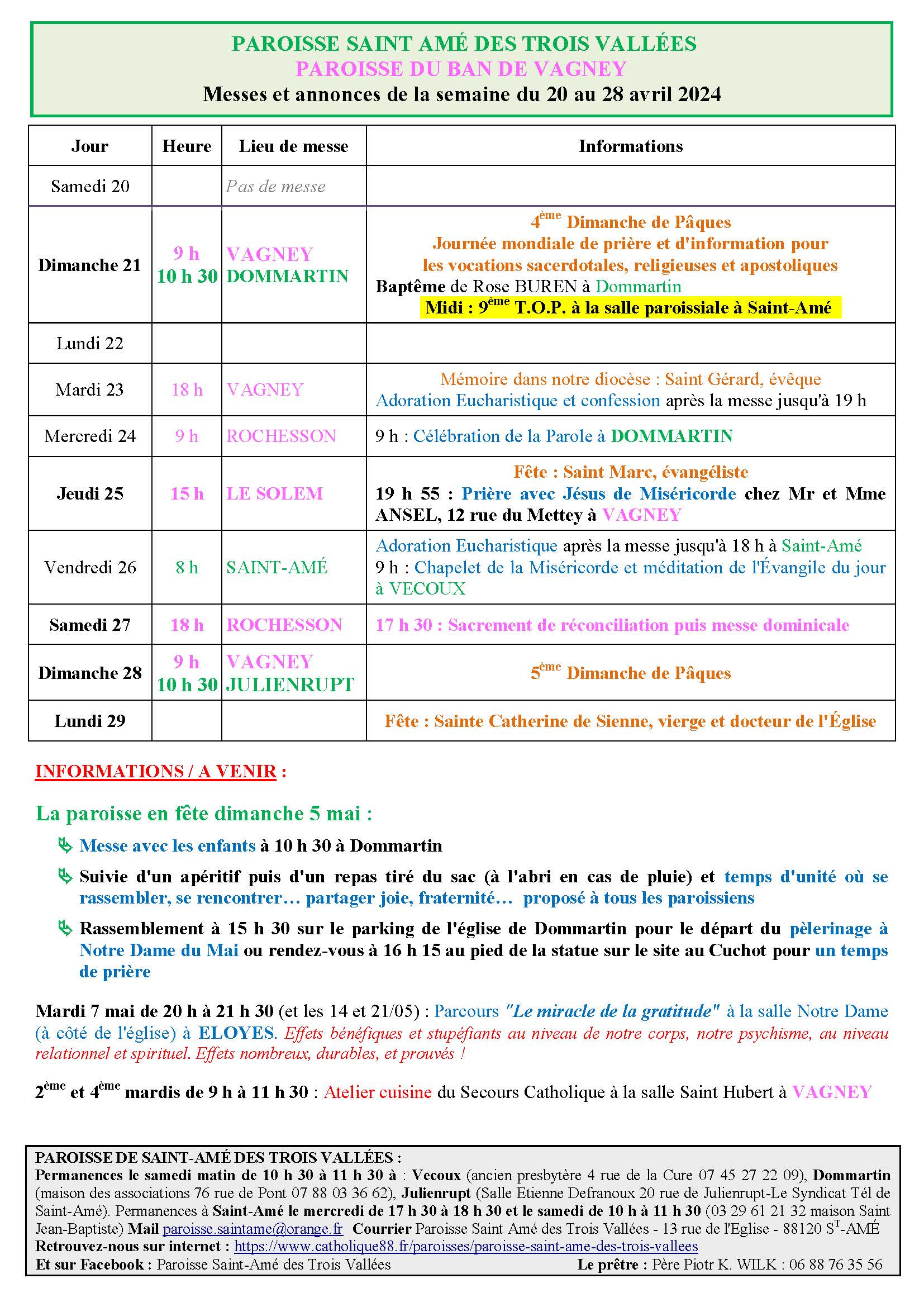 La Paroisse Saint-Amé des 3 vallées regroupe les secteurs de Saint-Amé, Cleurie, Julienrupt, La Forge, le Syndicat, Vecoux et Dommartin-les-Remiremont. Elle est née le jour de la Pentecôte 2000.