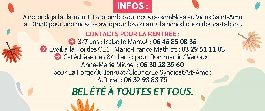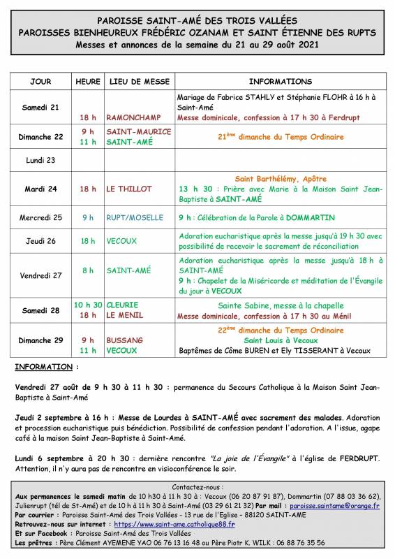La Paroisse Saint-Amé des 3 vallées regroupe les secteurs de Saint-Amé, Cleurie, Julienrupt, La Forge, le Syndicat, Vecoux et Dommartin-les-Remiremont. Elle est née le jour de la Pentecôte 2000.