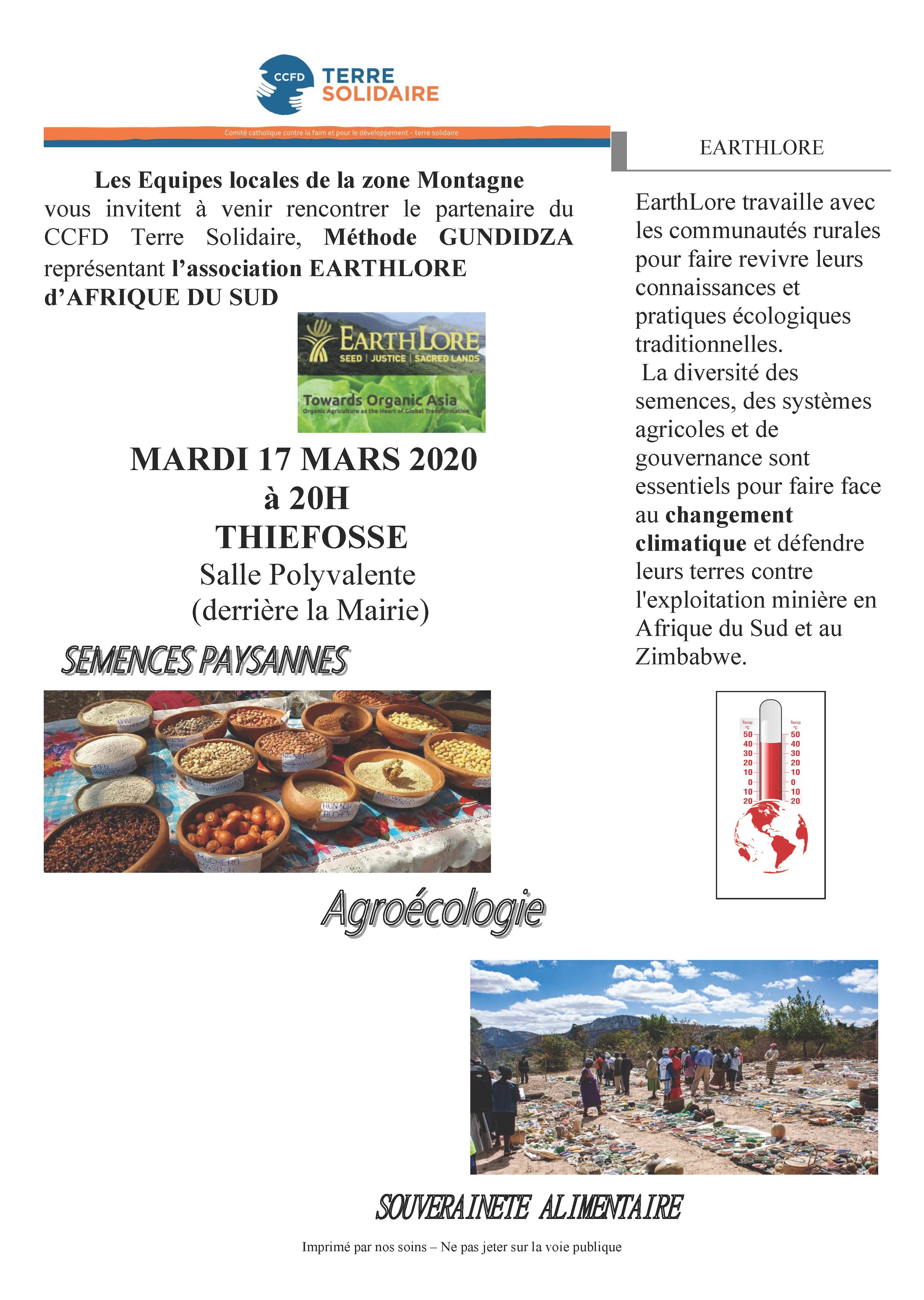 Les partenaires du CCFD ne viennnent plus en raison du risque de contagion du coronavirus. La soirée présentation d'Earthlore programmée le 17 mars à Thiéfosse est maintenue. Michel Devoille qui a rencontré ce partenaire lors de son voyage d'immersion en Afrique du sud en novembre présentera un diaporama sur les actions d'Earthlore : Défense des droits des autochtones, agroécologie et défense des semences locales.