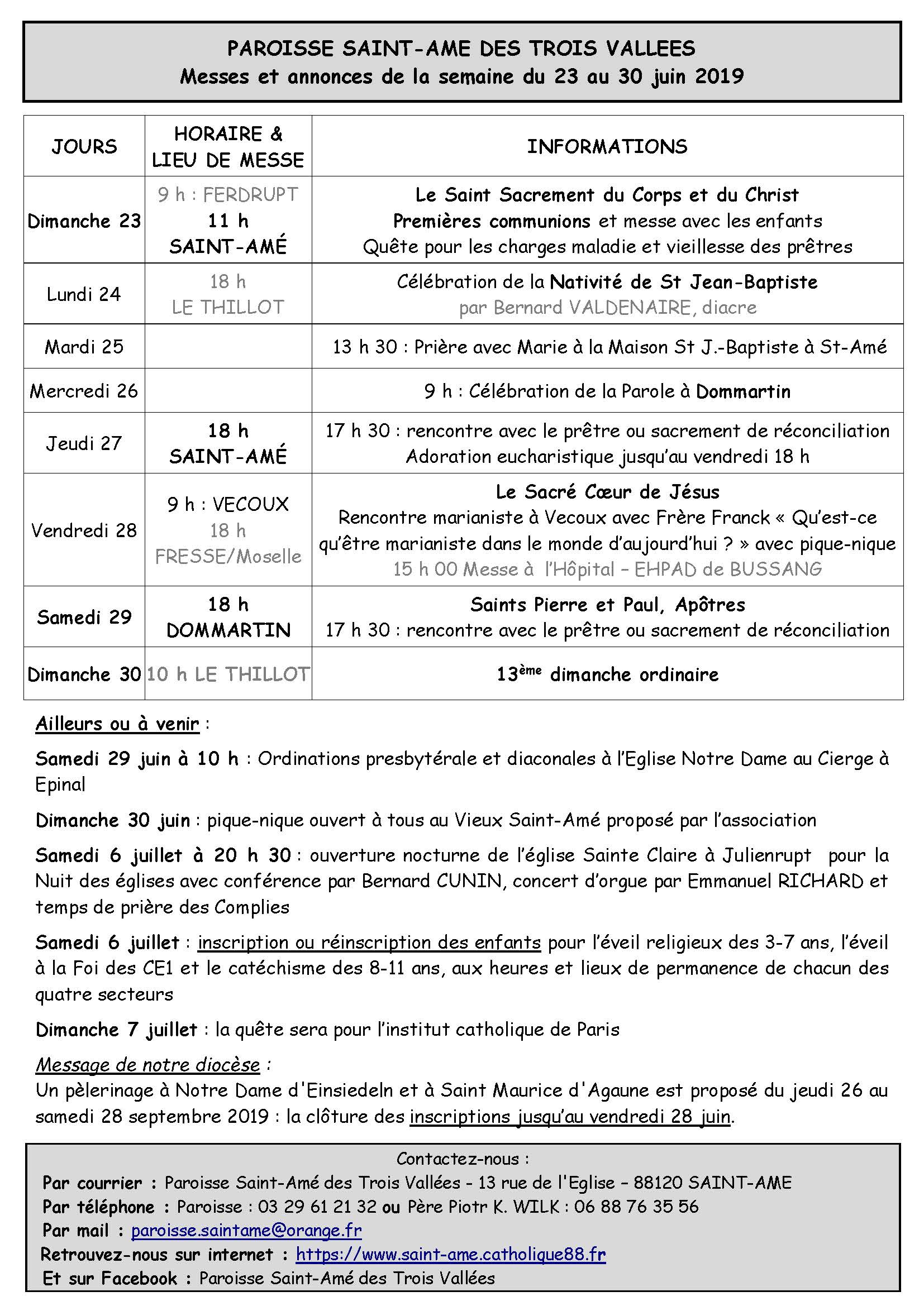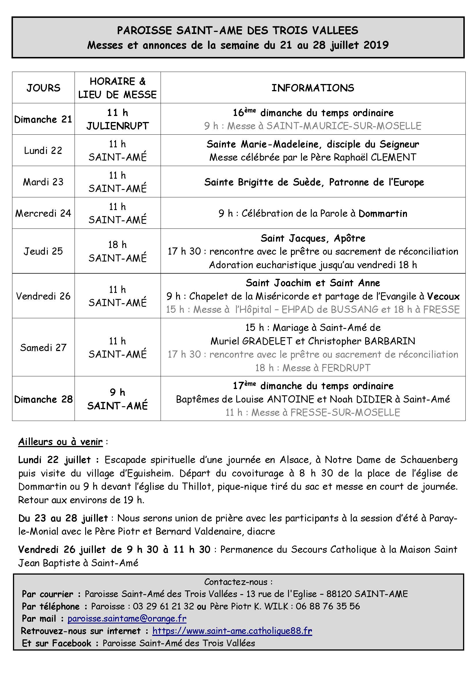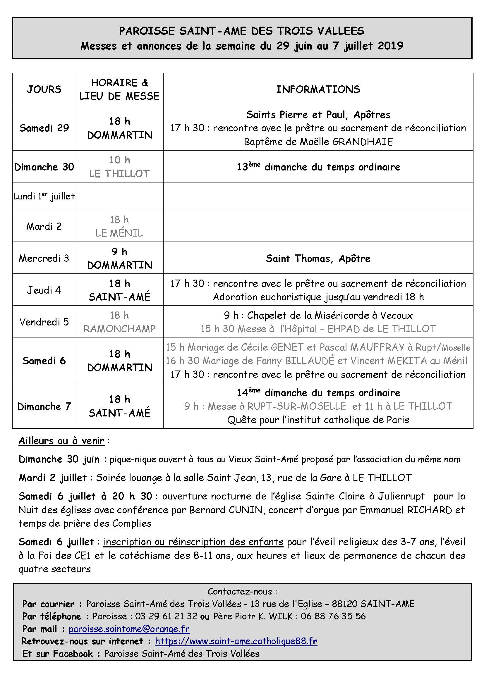 PLANNING DES MESSES DU 3e TRIMESTRE 2019
