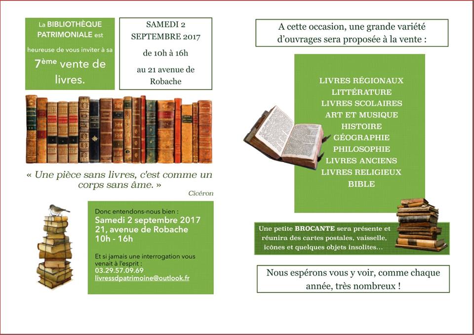 Venez nous retrouver le samedi 2 septembre au 21, avenue de Robache à la Bibliothèque Patrimoniale du Diocèse de Saint-Dié. Il y aura de nombreux livres sur plusieurs thèmes et un petit rayon brocante. Prevenez vos proches et venez, ne serait ce que pour la beauté du lieu !!!