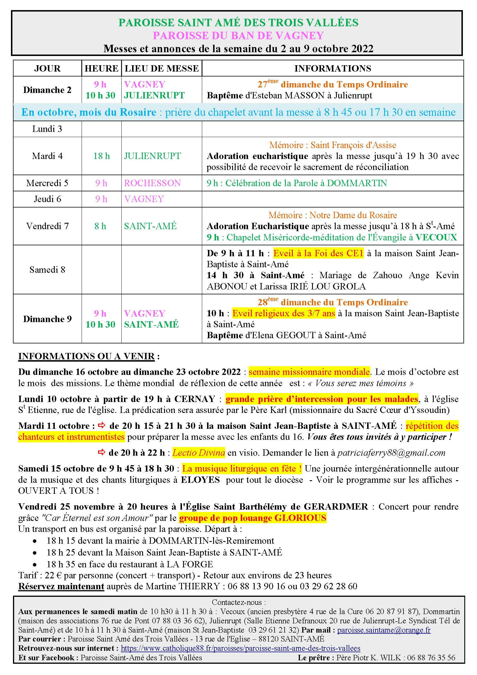 La Paroisse Saint-Amé des 3 vallées regroupe les secteurs de Saint-Amé, Cleurie, Julienrupt, La Forge, le Syndicat, Vecoux et Dommartin-les-Remiremont. Elle est née le jour de la Pentecôte 2000.