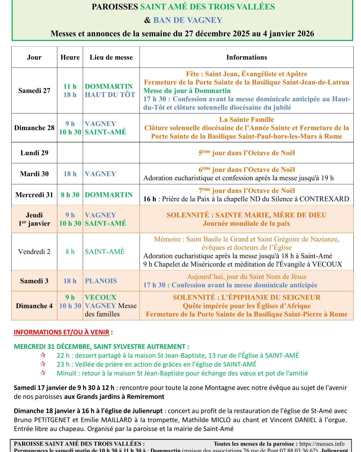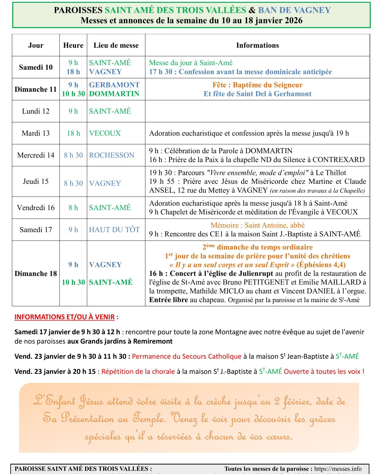 - Saint-Amé : de 10 h à 11 h 30