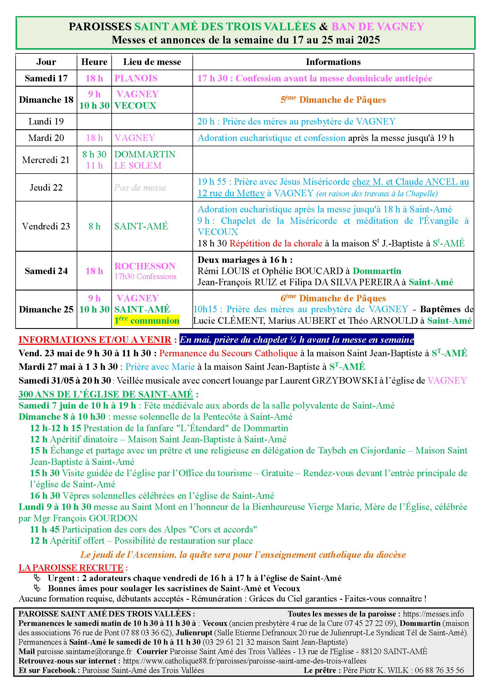 La Paroisse Saint-Amé des 3 vallées regroupe les secteurs de Saint-Amé, Cleurie, Julienrupt, La Forge, le Syndicat, Vecoux et Dommartin-les-Remiremont. Elle est née le jour de la Pentecôte 2000.