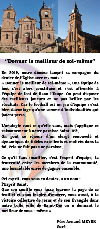 Notre paroisse porte le même nom que le diocèse auquel elle est rattachée et couvre la ville entière de Saint-Dié-des-Vosges.