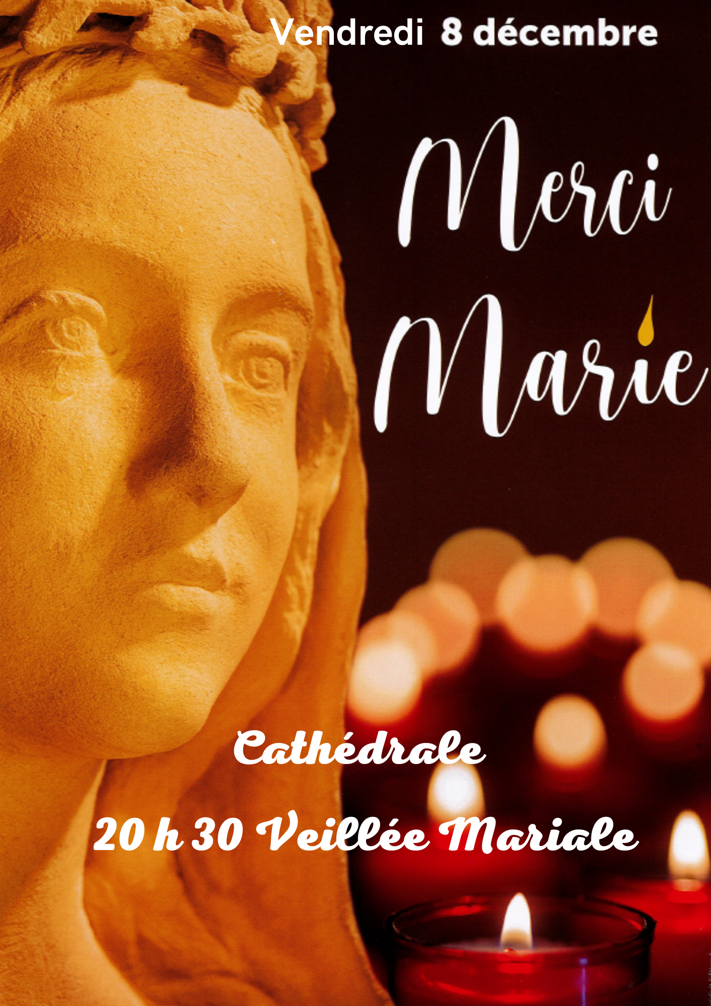 « La paroisse catholique de Saint-Dié organise une veillée mariale « Merci Marie » le vendredi 8 décembre 2023 à 20h30’ à la cathédrale. Dire « Merci Marie » le 8 décembre, jour de la fête de l’Immaculée Conception, c’est rendre grâce pour la présence protectrice de la Vierge Marie et l’occasion de lui confier toutes nos intentions. »