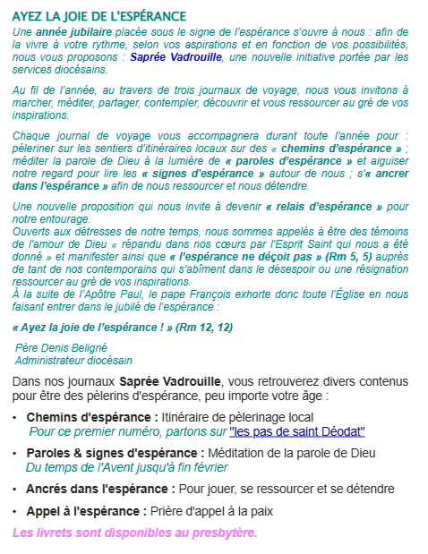Notre paroisse porte le même nom que le diocèse auquel elle est rattachée et couvre la ville entière de Saint-Dié-des-Vosges.
