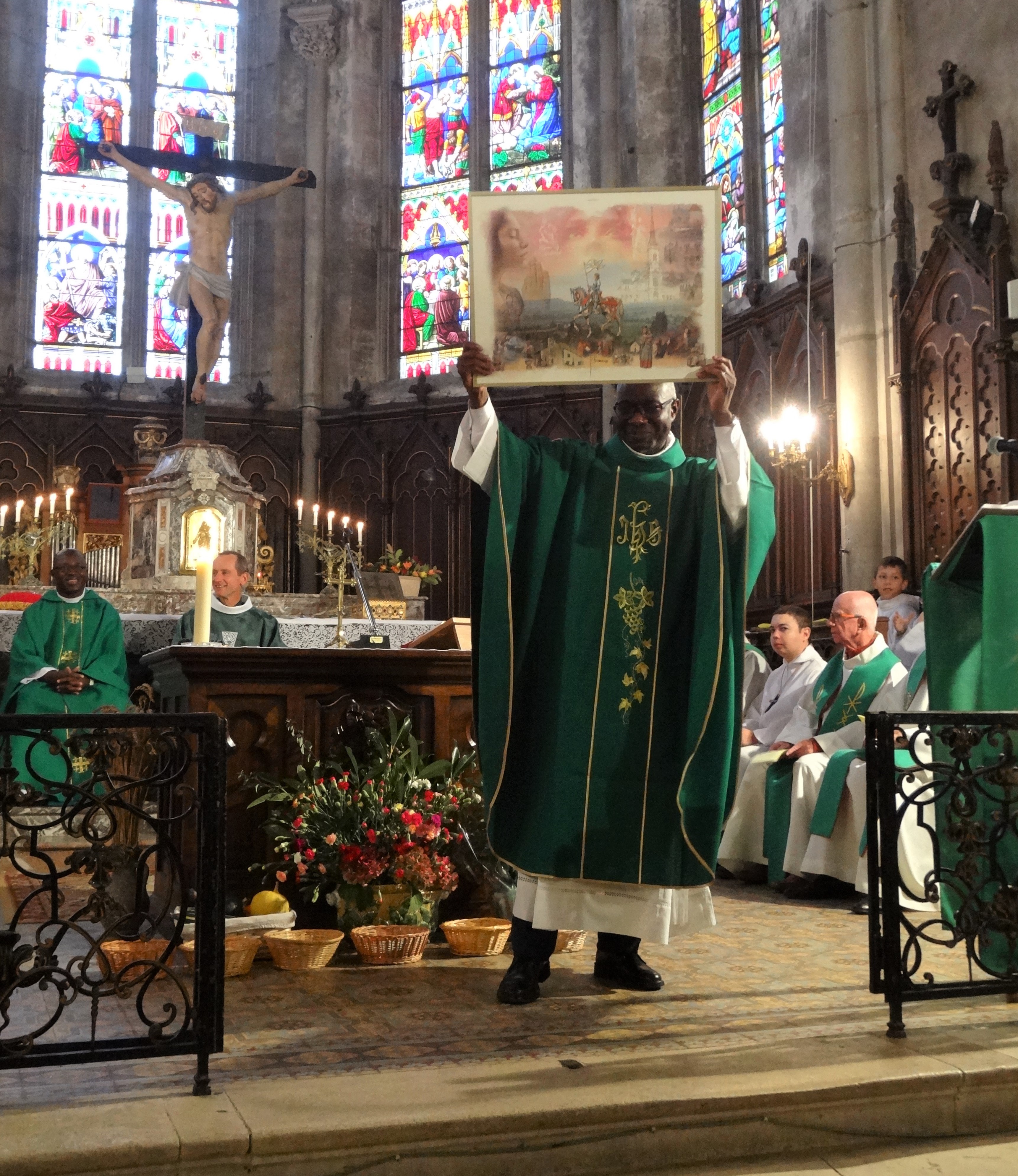 A la fin de la célébration, c’est l’heure des cadeaux de bienvenue : un tableau avec une image d’Epinal créée en 2011 et représentant différentes étapes de l’épopée de Jeanne d’Arc, et un livre intitulé «La grâce des jours uniques : éloge de la célébration», écrit par Gabriel Ringlet, écrivain, poète et théologien belge.